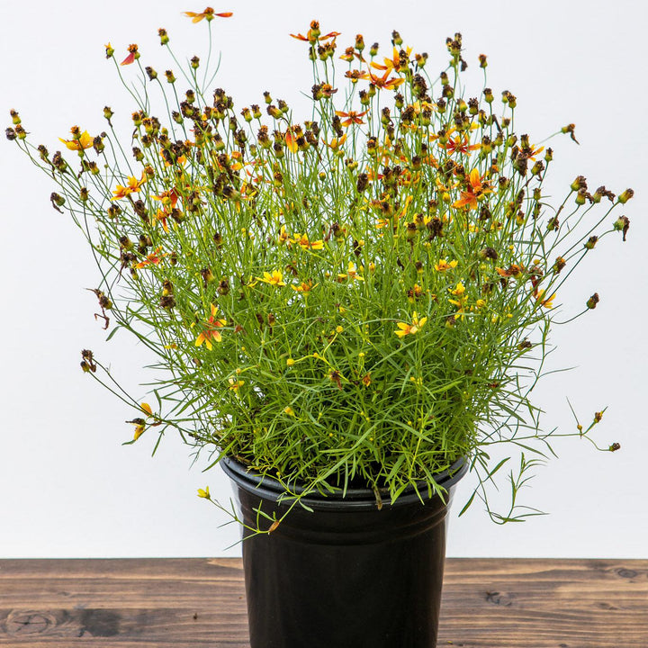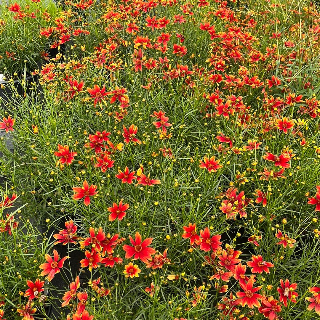 Broad Street Coreopsis is a hardy late-blooming perennial native with a mounding habit. The narrow deep green foliage is topped by vermillion red daisy-like flowers in summer until frost. Prefers full sun and moist, well-drained soil. Drought, humidity, and road salt tolerance.