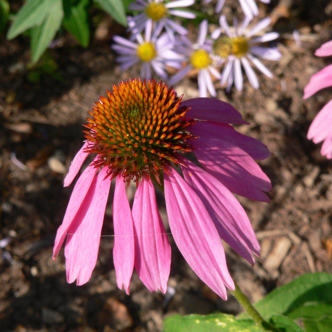 Kim's Knee High Echinacea is a compact freely branching native perennial with strong upright stems that do not need staking and dark green foliage. The large, lightly fragrant flowers with clear pink drooping petals and orange cones bloom throughout summer.  Thrives in full sun and well-drained soils.  The flowers attract butterflies and bees, and spent stems will stay erect and attract birds if not removed.  Drought tolerant.