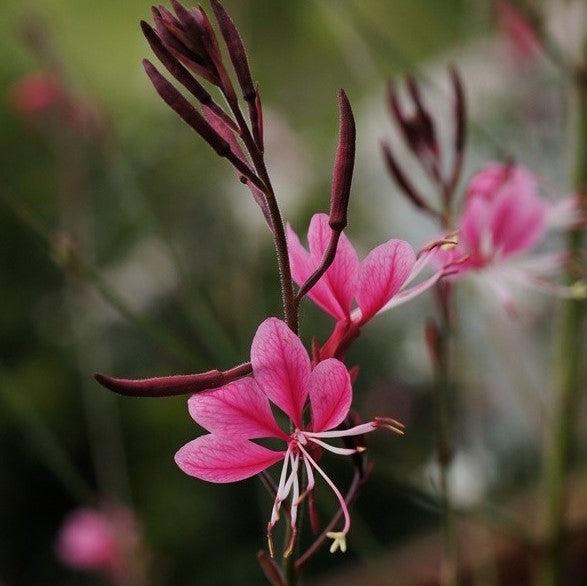 Passionate Rainbow Gaura is a native herbaceous perennial with narrow lance-like foliage that has narrow white margins that emerges with pink molting. dark red buds open to four petaled pink flushed flowers that bloom on stems above the foliage several time from late spring throughout summer. Prefers full sun and loamy well-drained soils. Heat, Humidity, and drought tolerant.