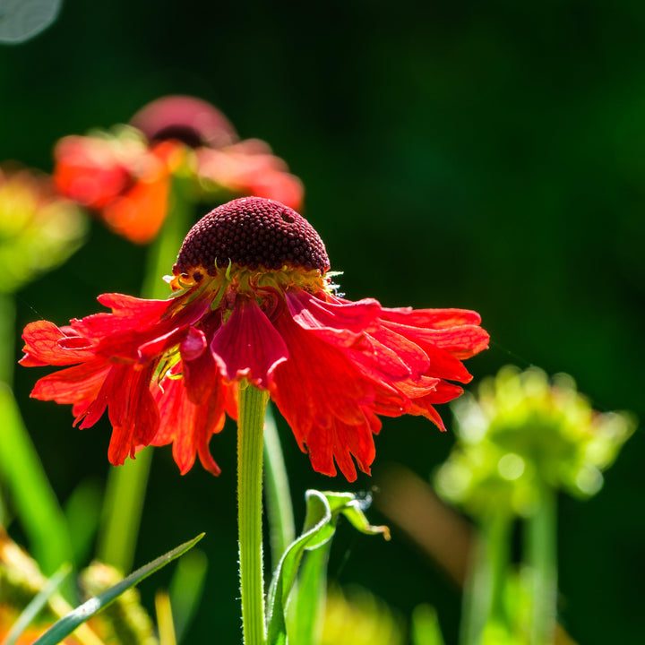 Monrovia® HayDay Red Sneezeweed is a compact erect native perennial with rigid winged stems that branch at the tops and lance-shaped leaves. Clusters of vivid red flowers resembling daisies with distinctive wedge-shaped petals with prominent center disks bloom in summer. Grows best in full sun and medium to wet well drained soils.