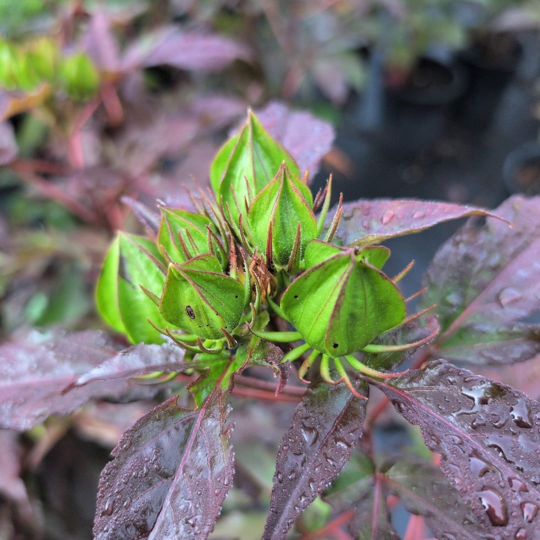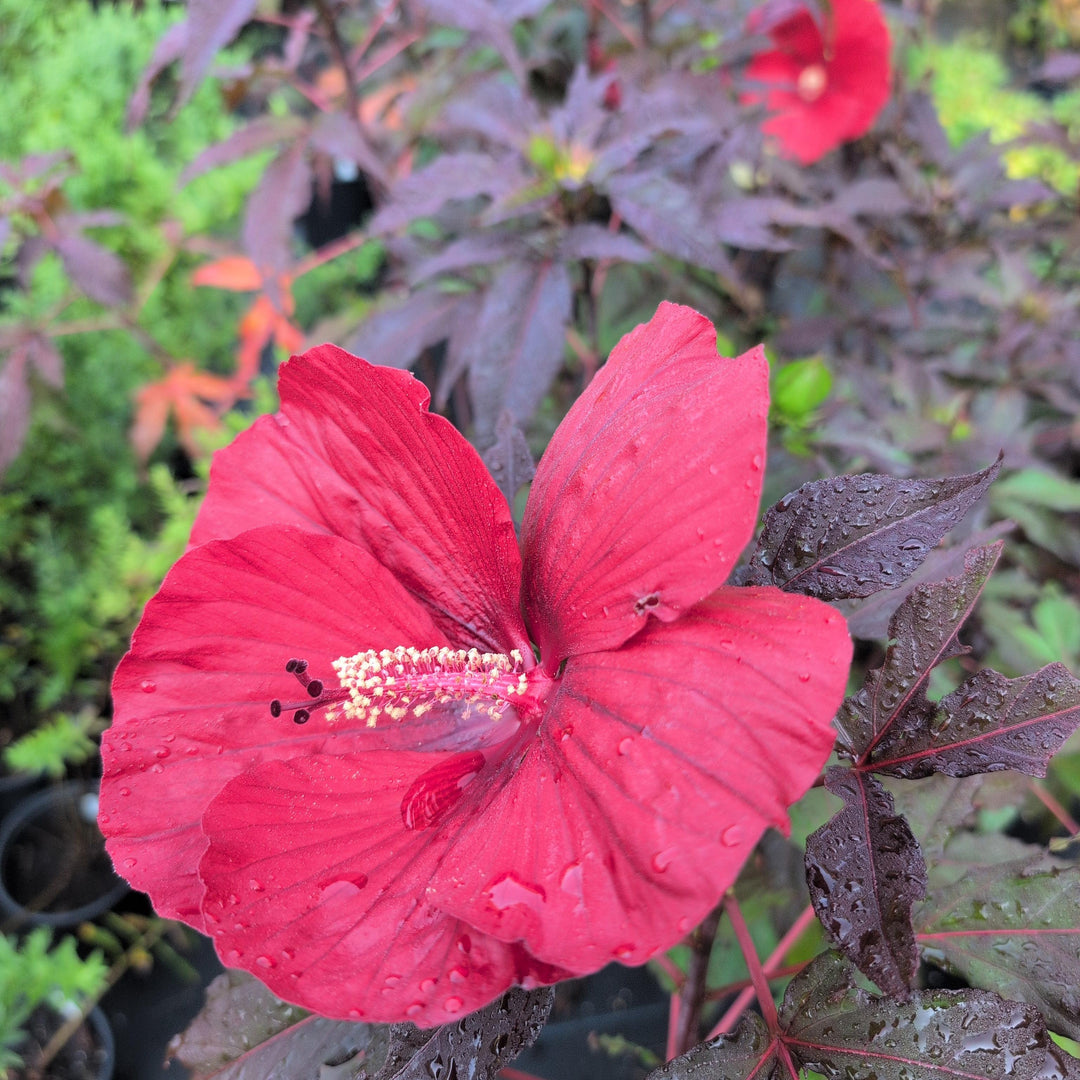 Midnight Marvel is a well branching deciduous shrub with a mounding habit. The long violet maple shaped leaves turn brilliant orange in fall. The fall color contrasts nicely with the huge 9” carmine red flowers with a prominent yellow tubular stamen that bloom mid-summer until the first frost attracting butterflies. Best bloom in full sun and rich, moist well-drained soils.