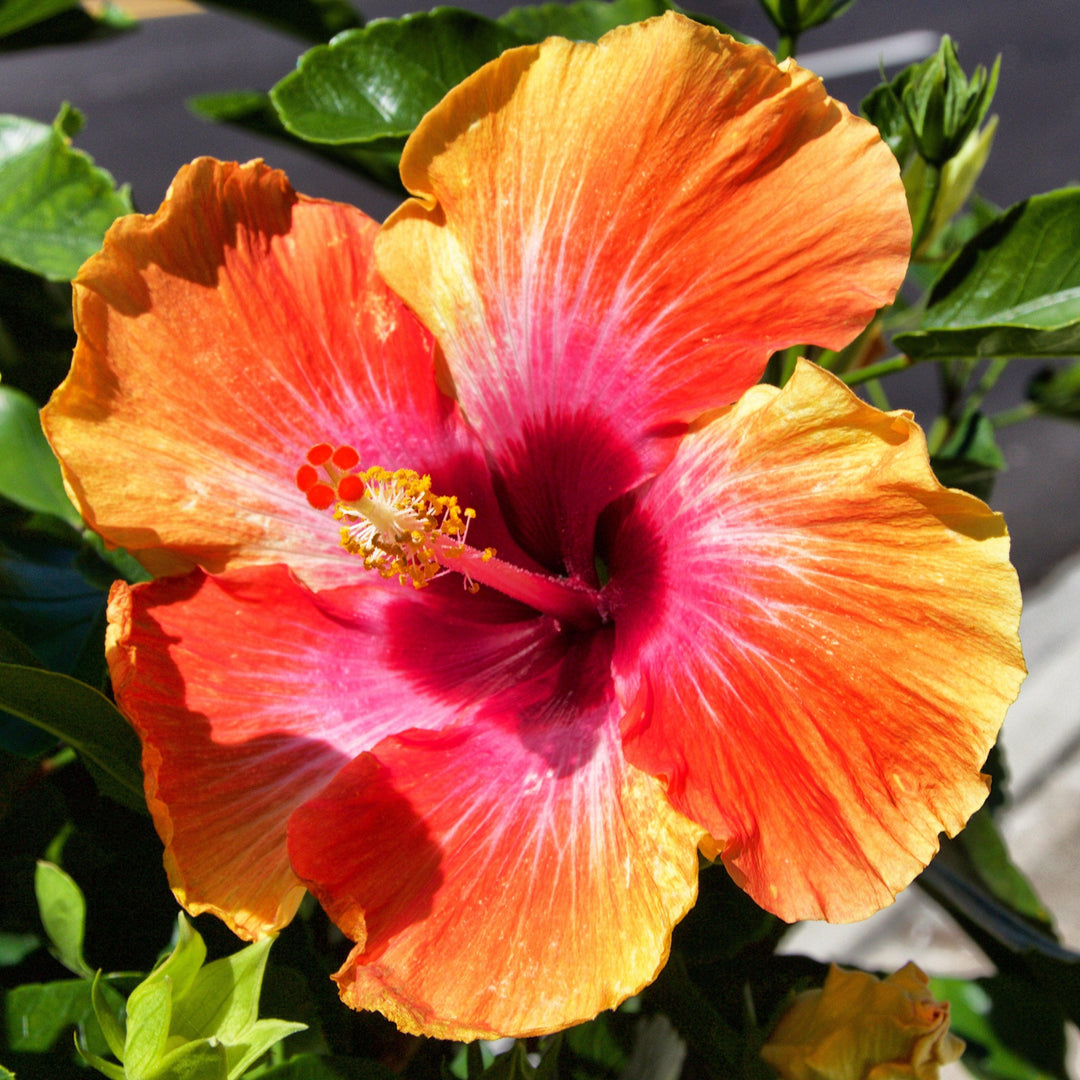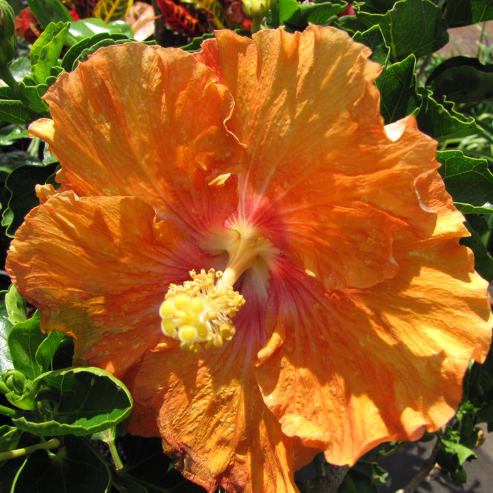 Fiesta Hibiscus is a large tender tropical shrub treated as an annual with toothed foliage and large, color shifting flowers.  These colorful flowers have rippled edges and open a warm orange with a white eye and quickly develop a red eye and expanding central pink flush.  Outside plants in their zones will flower year-round or till frost, while indoor plants bloom through spring until late summer.  Grows best with full sun and rich, moist well drained soils.