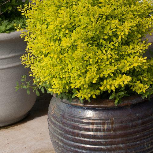 Sunjoy Citrus Barberry is a rounded deciduous shrub valued for its tidy vibrant foliage that grows full to the ground.  The small leaves are a bright golden yellow where the sun touches and chartreuse in shade.  Unnoticeable tiny yellow flowers bloom in fall that gives way to small amounts of fruit.  Best color in full sun and well-drained soils. Drought and deer resistant.  Asexual propagation is prohibited.  Citrus has proven sun resistance to be planted in full sun.