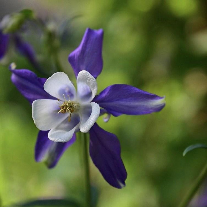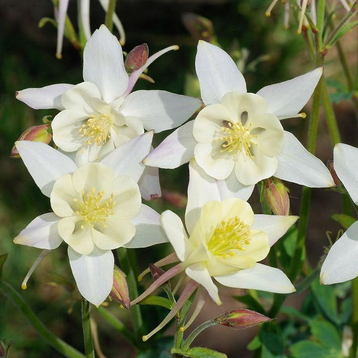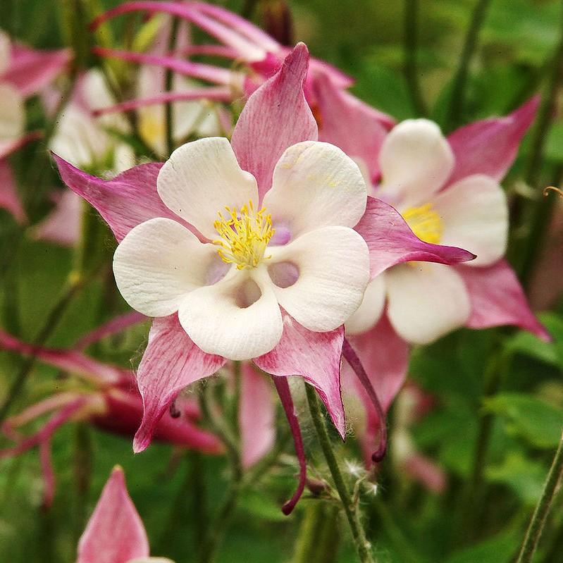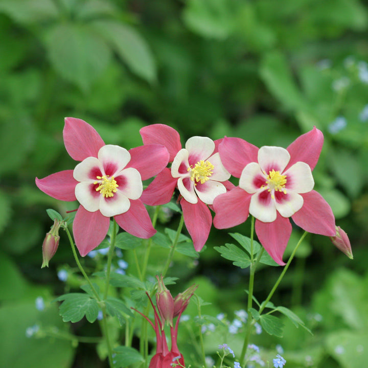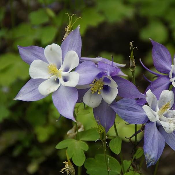 Songbird Mix Columbine is a compact native wildflower perennial with delicate fern-like medium green foliage. Distinctive large upward facing flowers come in a range of colors: white, yellow, red and white, pink and white, blue and white, and purple and white. The flowers bloom in spring attracting hummingbirds. Removing stems after flowering may encourage another bloom. Flowers best in filtered sun and rich well-drained soils.