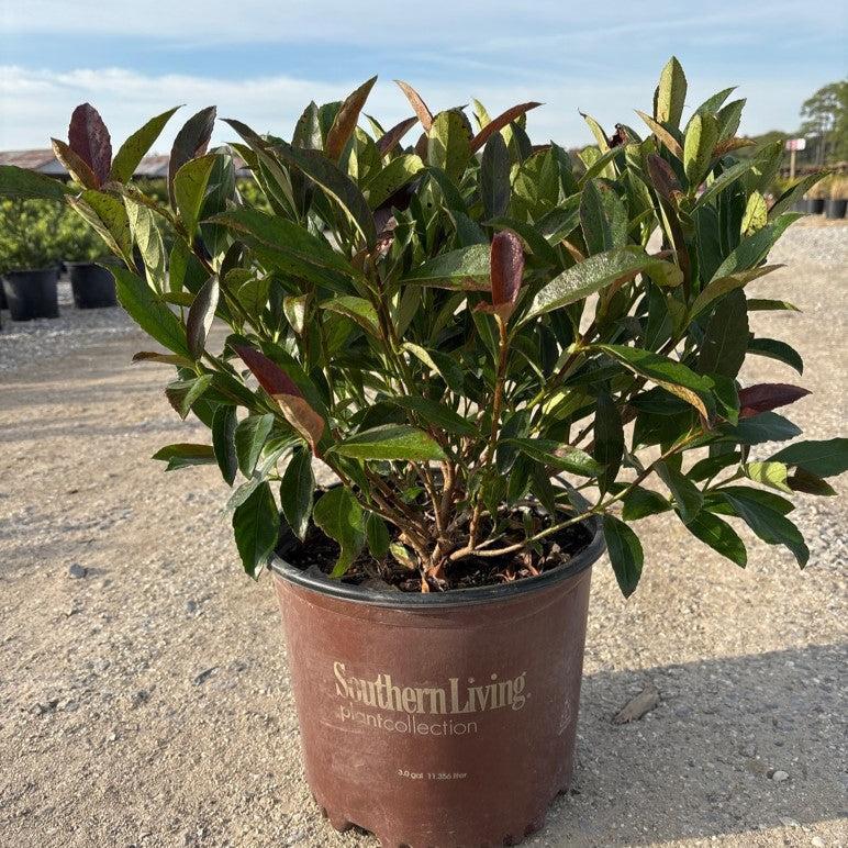 Coppertop Sweet Viburnum is an upright multi-stemmed evergreen shrub with deep maroon to copper new growth that returns with each pruning and turns deep green in winter. Clusters of fragrant tiny creamy white flowers bloom in spring and give way to red berries that mature to black in fall. Flowers best with full sun and moist, lightly acidic well-drained soils. Drought tolerant once established.