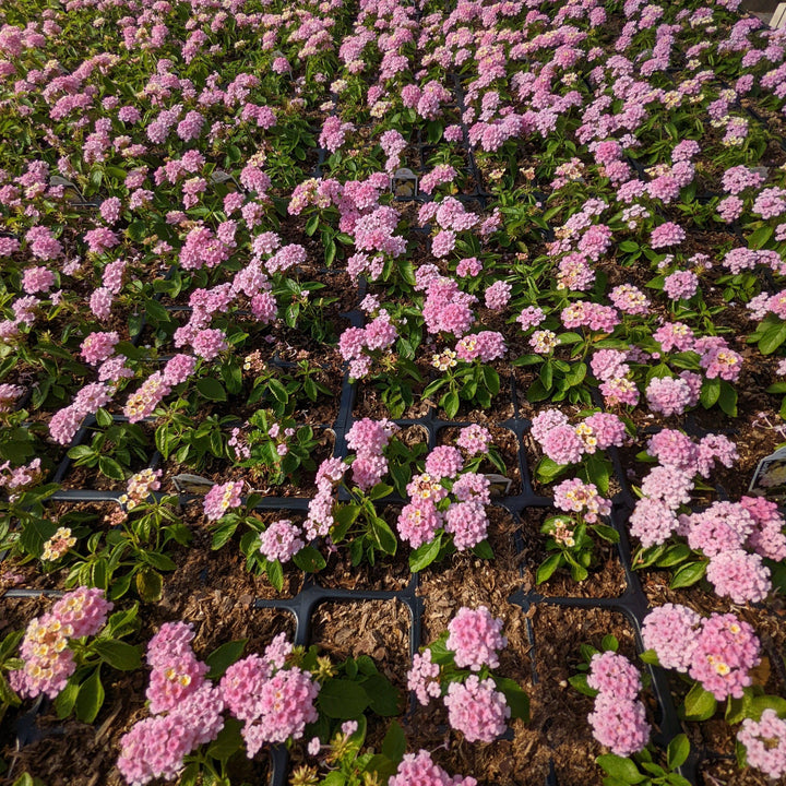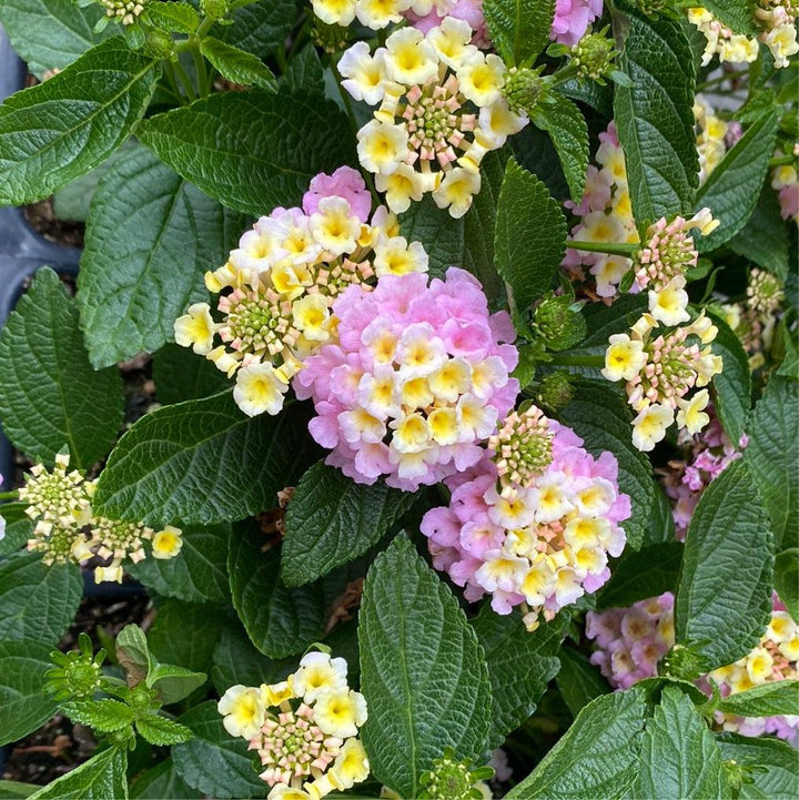 Lucky Lavender Lantana is a compact semi-evergreen perennial that acts as an annual when planted outside with an upright habit and dark green foliage. The large clusters of multi-hued flower balls shift from the center of cream and yellow to soft pink lavender and bloom from late spring through summer attracting butterflies. Best color in full sun and rich well-drained soil. Drought tolerant once established. Toxic if ingested.