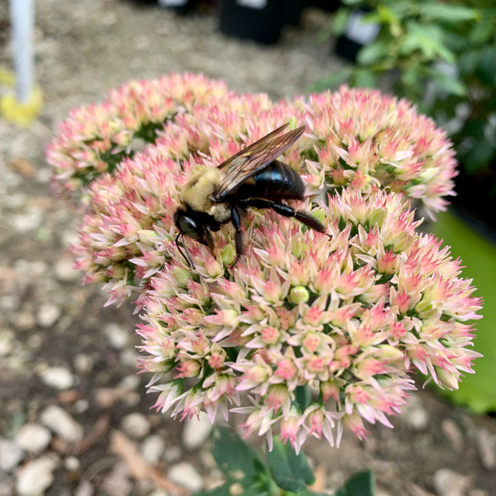 Autumn Joy Stonecrop is a tough upright clumping evergreen succulent with large light green scalloped fleshy foliage. Large disk-shaped clusters of small pink star-shaped flowers that mature to russet cover the plant in late summer to fall attracting butterflies. Grows best in full sun and dry to medium well-drained soils. Drought and heat tolerant once established.
