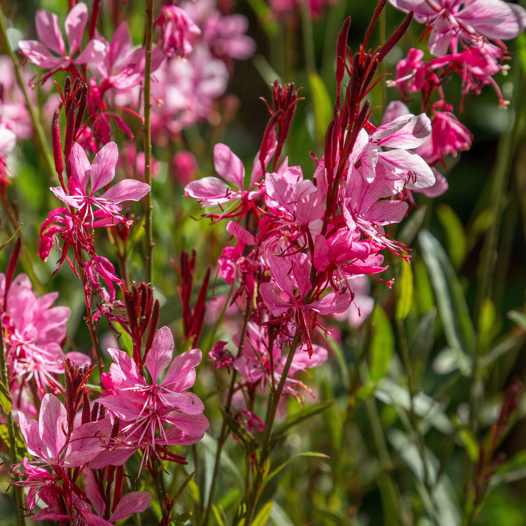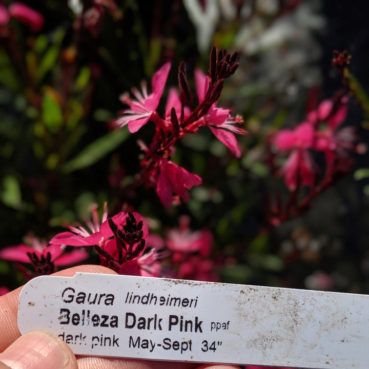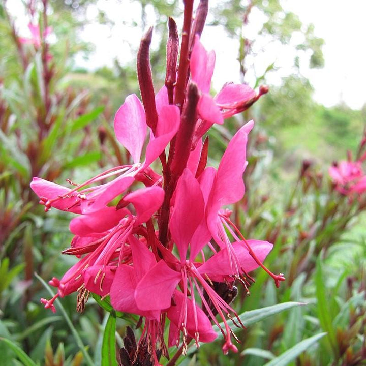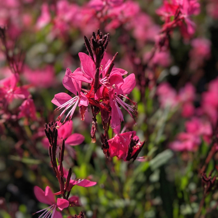 Dark Pink Gaura is a compact native herbaceous perennial with lance-like foliage. Five petaled, rose-pink flowers bloom on stems above the foliage from late spring to fall. Prefers full sun and loamy well-drained soils. Heat, Humidity, and drought tolerant.