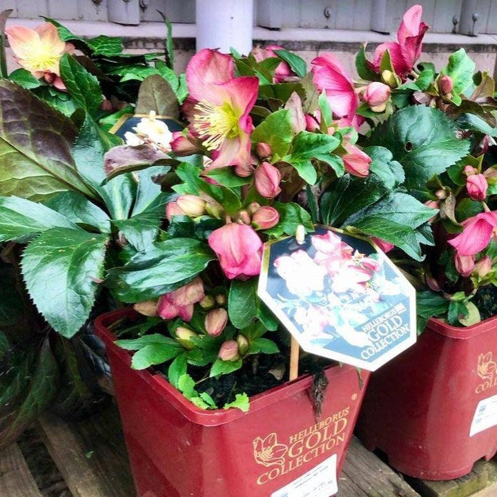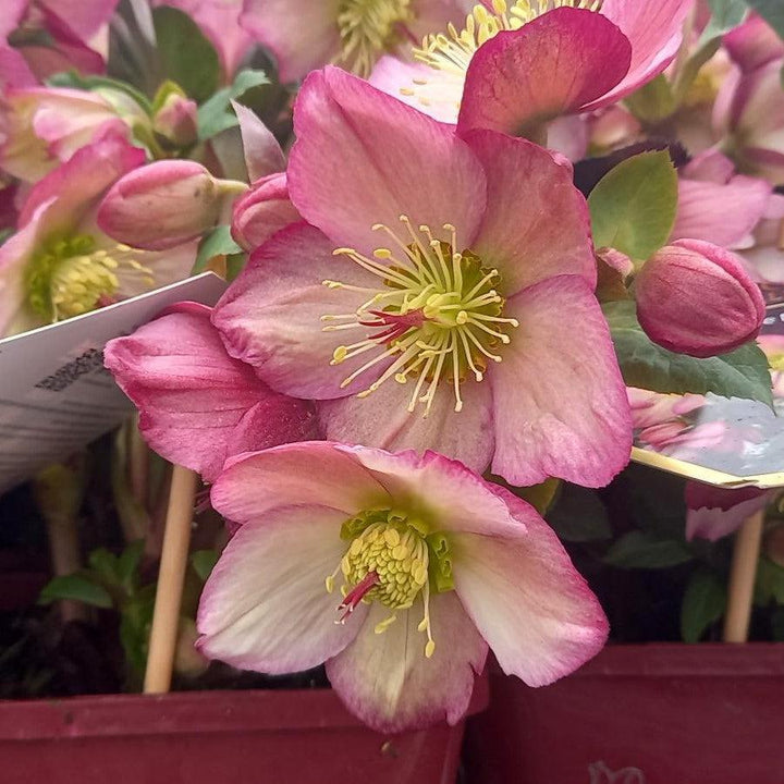 Ice N' Roses Rosali Lenten Rose is a late winter-blooming evergreen perennial with glossy dark green basal foliage. Clusters of outward facing white flowers with magenta pink backing and flushing that starts from the edges bloom on dark stems from late winter to mid spring. Best bloom in dappled sun and moist well-drained soils. All parts of the plant are toxic if ingested.