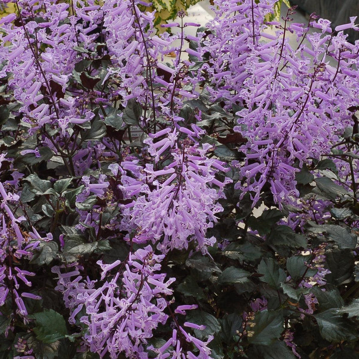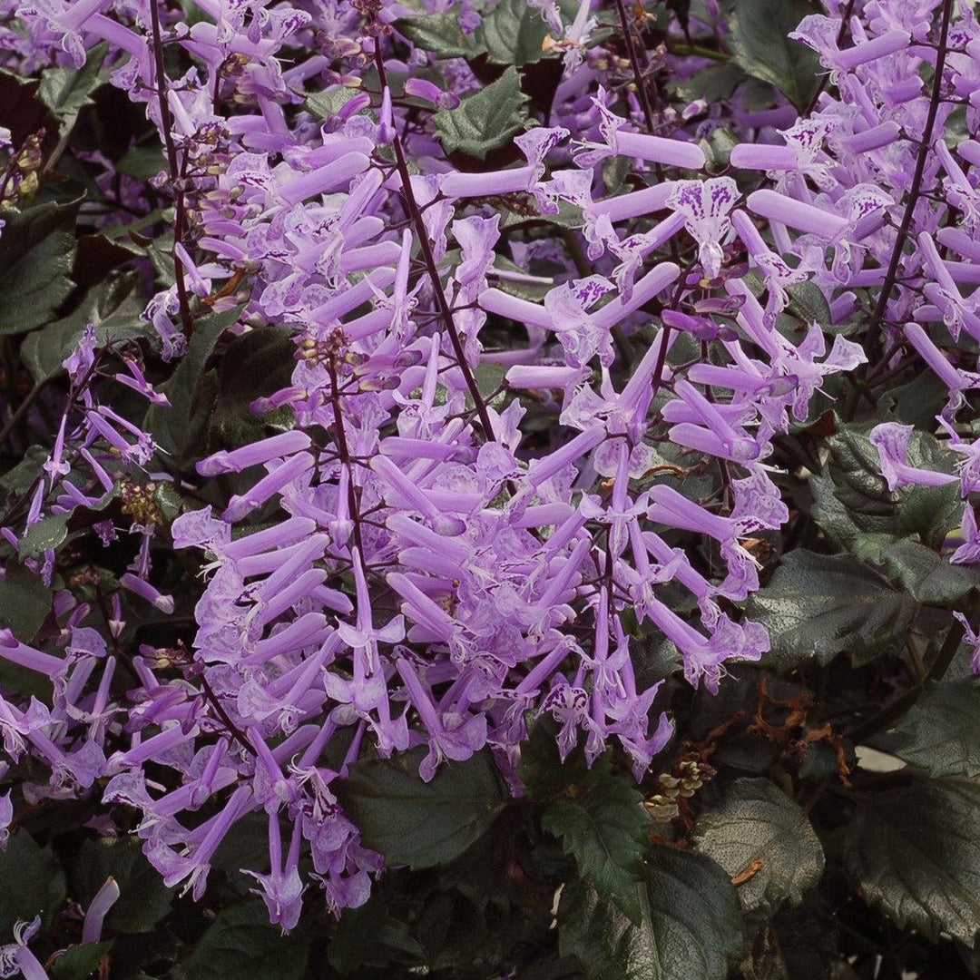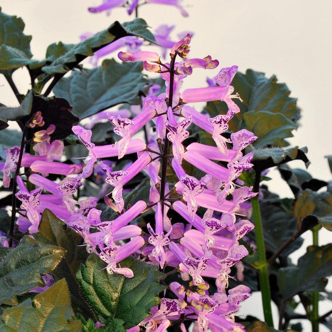Velvet Elvis Plectranthus is a mounding evergreen perennial with whorls of thick velvety dark green foliage with vibrant purple undersides. Abundant spikes of larger mint-like deep lavender flowers bloom from late summer into early fall. Grows best with good direct sun and consistently moist well-drained soils and moderate humidity. Treat as an annual when planted outside. Velvet Elvis is disease resistant.