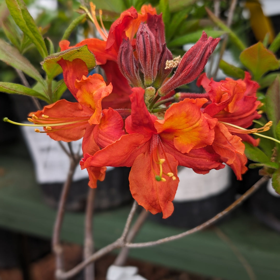 Nathan Bedford Forrest Native Azalea is an open upright native deciduous shrub that is part of the Confederate General Series that is noted for its larger fragrant flowers. Nathan Bedford Forrest has large ruffled orange flowers that bloom in spring as new growth emerges and dark green foliage that turns orange-bronze in fall. Best grown in part sun and rich, moist, acidic well-drained soils. Both powdery mildew resistant and heat tolerant.