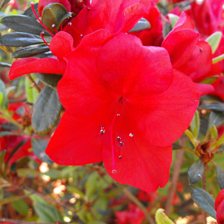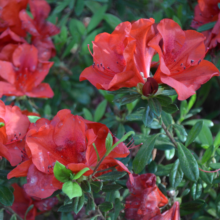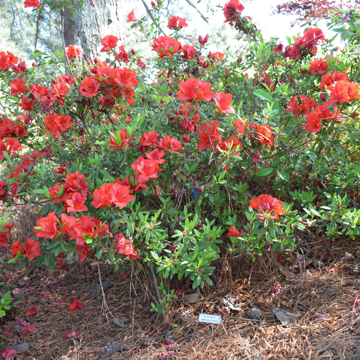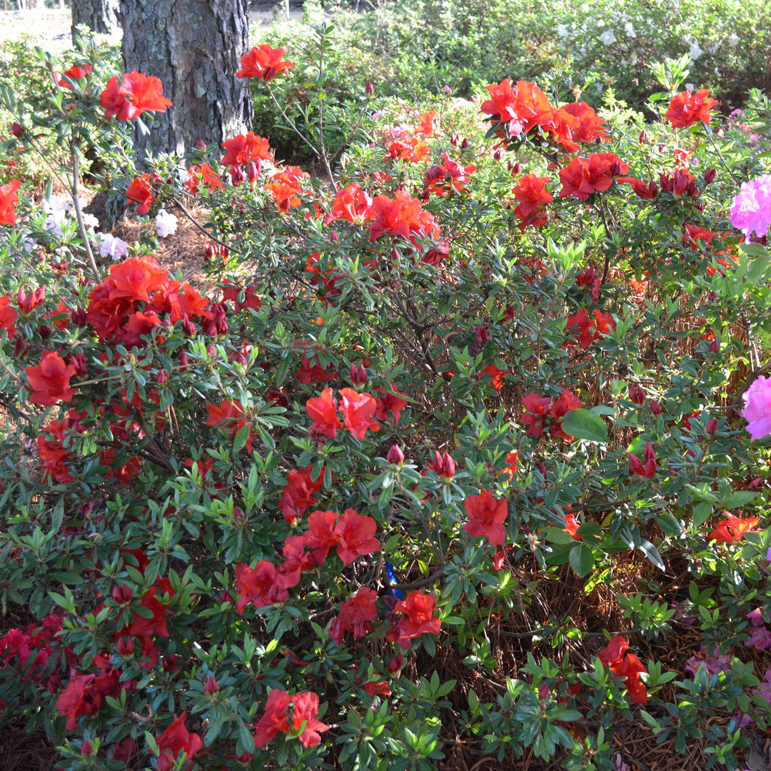 Fireside Red Azalea is a rounded reblooming evergreen shrub with small glossy dark leaves. Clusters of large intensely red flowers bloom first through spring and again in fall. A very versatile plant that prefers partial sun with acidic rich, well-drained soils. Azaleas are excellent pollination and butterfly attractors.