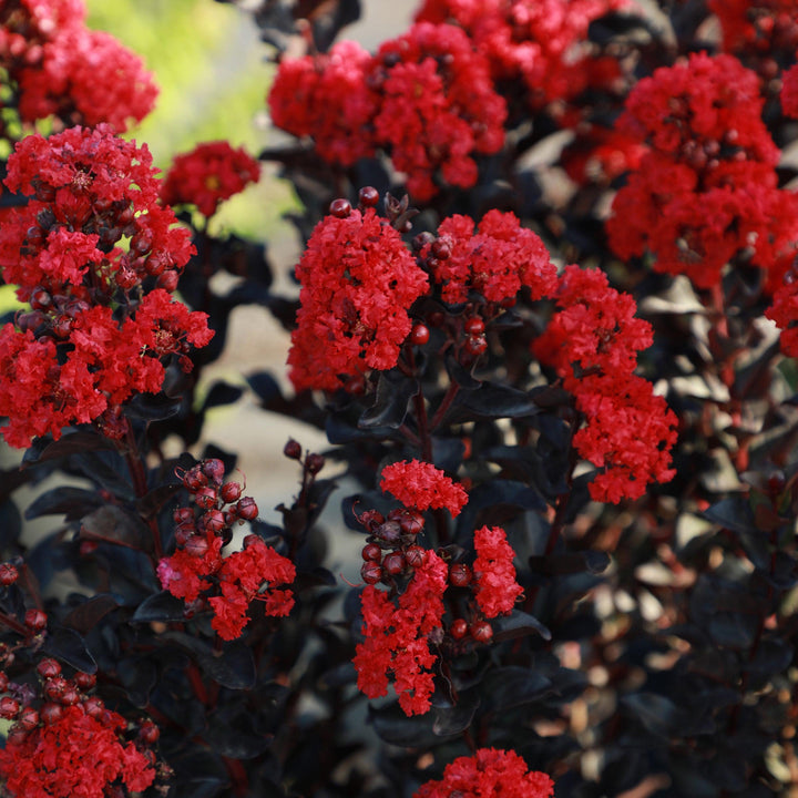 Radiant Red Crape Myrtle is a compact tree with an vase-like habit and intense inky black foliage that holds its color in summer.  Large contrasting panicles of saturated deep red flowers bloom from mid summer until frost.  Prefers full sun and moist, well-drained soil. Radiant Red is drought tolerant and has high mildew resistance.