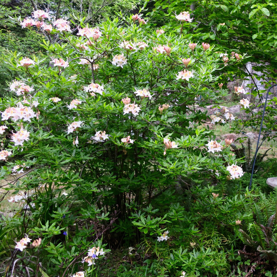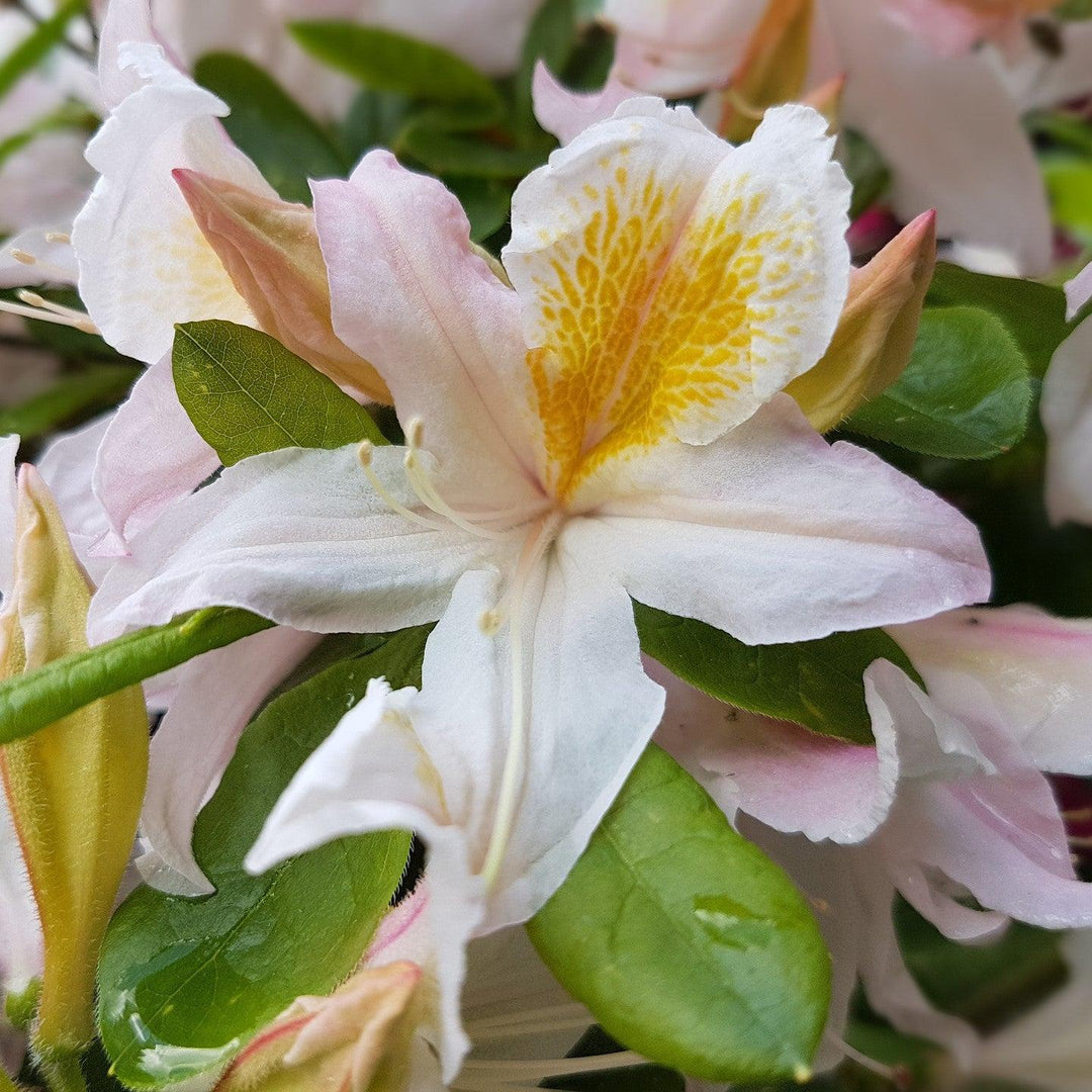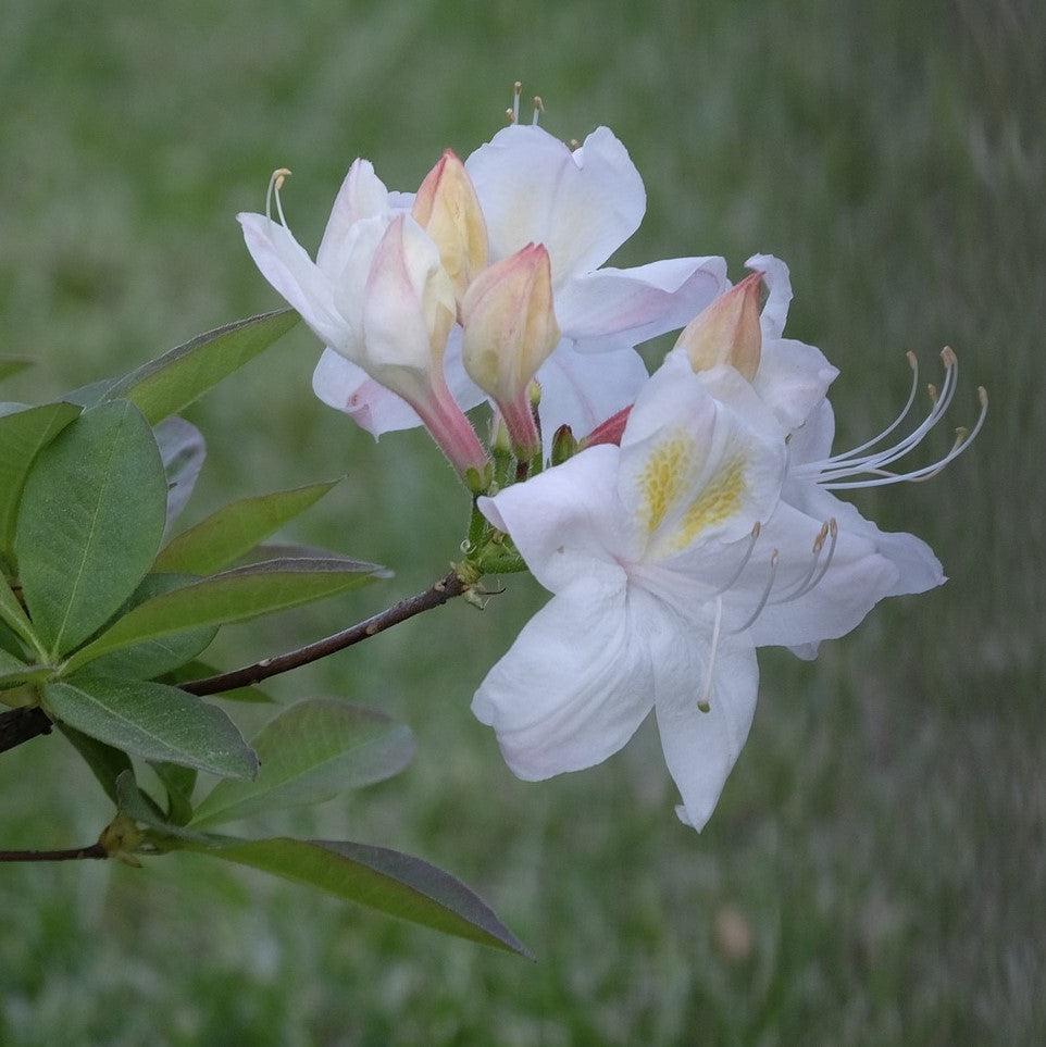 Darlin's Dream Native Azalea is an upright deciduous shrub with a loose habit and light green foliage. Its sweetly fragrant clusters of white honeysuckle-like flowers with a yellow dorsal spot and soft pink edging blooms in spring. Best grown in part sun and rich, moist, acidic well-drained soils.