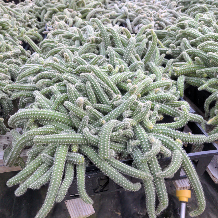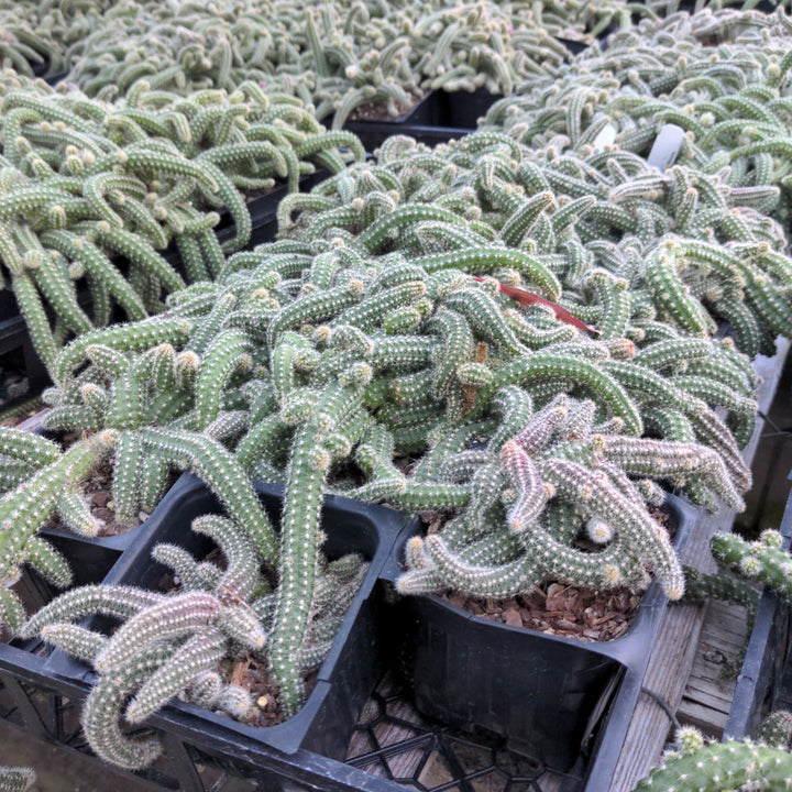 Peanut Cactus is a dense creeping succulent cactus with curling light green finger-like stems coated with short bristled spines that are relatively soft to the touch. Large orange-red flowers bloom in flushes from late spring into summer. Grows best in full sun and dry well-drained soils.