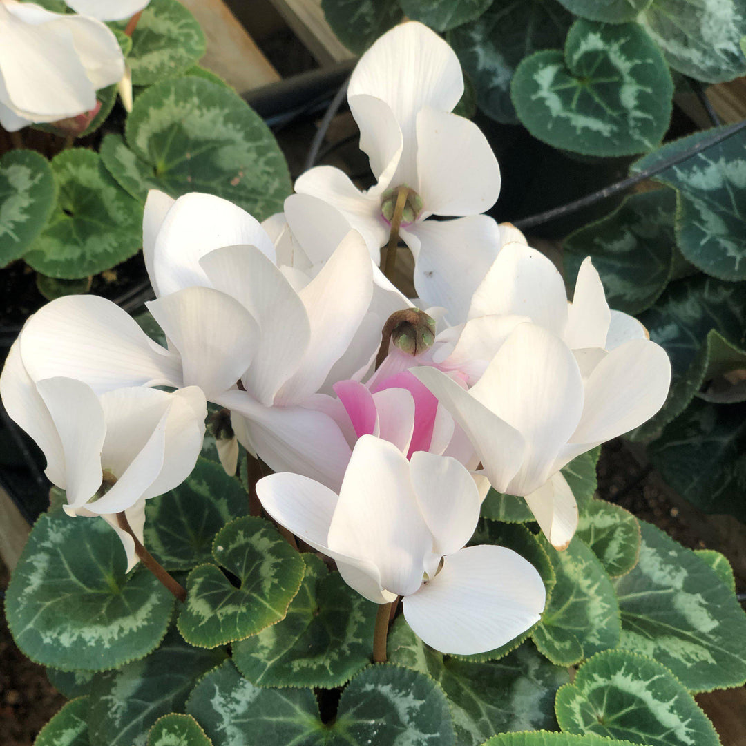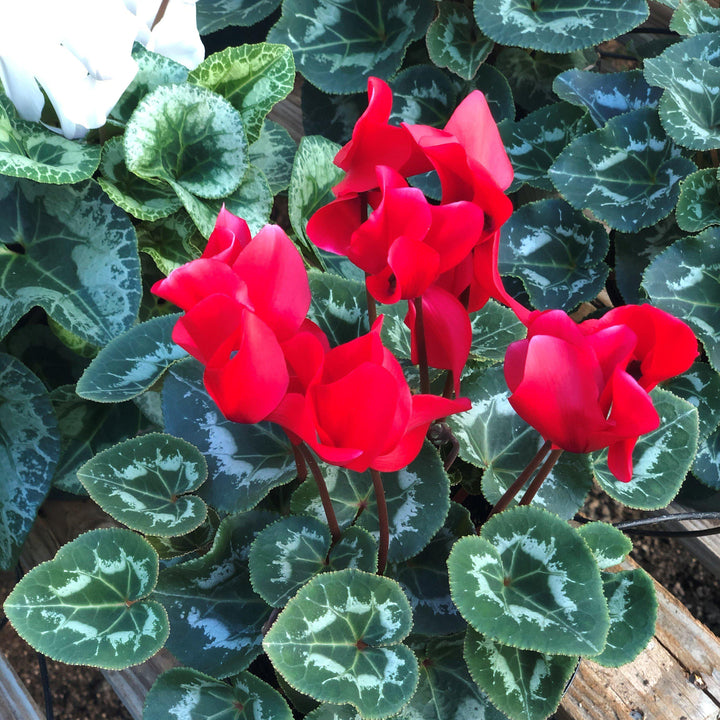 Cyclamen is a small bulb perennial with long stalked dark green basal foliage with silver blotching or veining commonly used as a gift or houseplant. The flower stalks sport vibrant flowers with twisted or recurved petals from winter into spring. Grows best with bright indirect sun and rich well-drained soils.