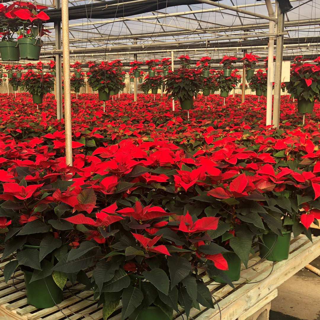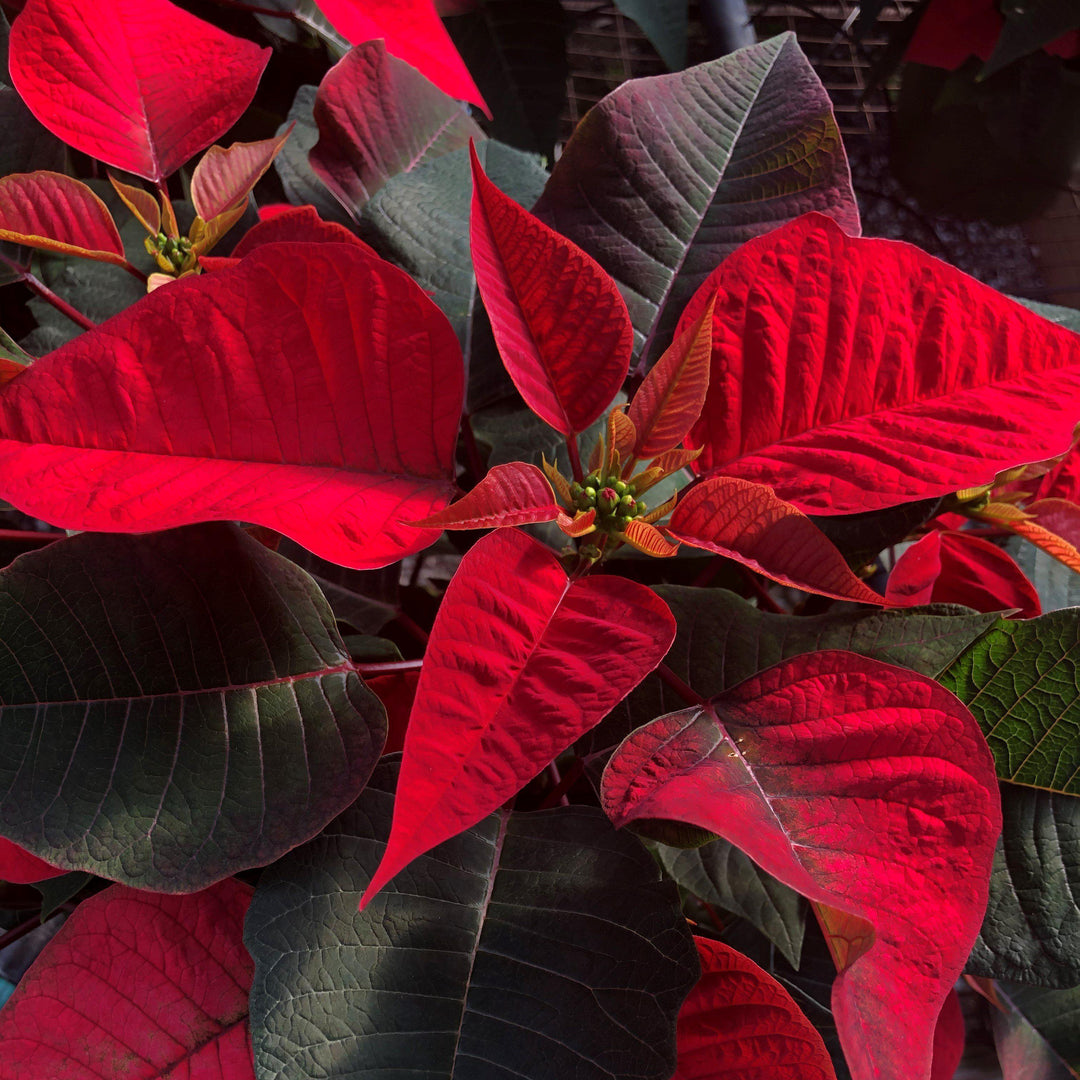Red Poinsettia is a popular semi-evergreen shrub well known as a Christmas ornamental or used as a houseplant. Its large dark green foliage creates a low mound and is topped by huge dark red bracts around tiny flower clusters from winter through spring. Grows best with bright indirect sun and moist well-drained soils. Only grows to 2-3ft when potted.
