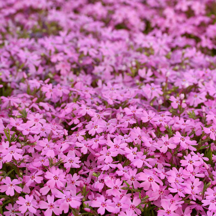 GoldiPhlox Rose Creeping Phlox is a creeping low-growing evergreen perennial that forms a dense carpet of dark green needle-shaped foliage.  Striking masses of rose pink flowers with magenta marked centers coat the plant from mid to late spring attracting butterflies.  Best flowering in full sun and rich, moist, well-drained soils.  Deer resistant.