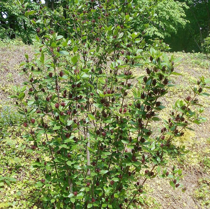 Sweetshrub is dense rounded deciduous shrub with aromatic luscious dark green leaves that turn gold in fall. Highly fragrant dark red magnolia-like flowers bloom in late spring into summer which give way to fruits that persist into winter. Grows best in full sun and moist, well-drained acidic soils.
