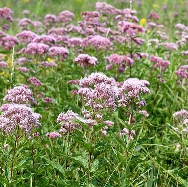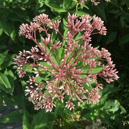 Coastal Plain Joe Pye Weed is a sturdy upright native perennial with coarsely-toothed lance-shaped foliage and un-branching purple spotted stems. Clusters of feathery lavender-pink flowers bloom in flat clusters atop of stems from late summer into fall and turn buff as they mature. Blooms best in full sun and moist well-drained soil. Some drought tolerance and pest resistance.