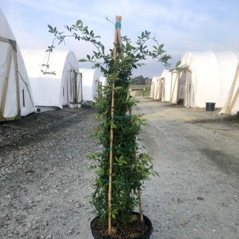 Lady Banks White Rose is a vigorous climbing evergreen shrub with lightly fragrant clusters of densely packed white double flowers that bloom from spring into summer.  The glossy dark green foliage is nearly thornless and can also be used as a groundcover if not supported.  Best grown in full sun and rich, moist, slightly acidic well-drained soils.  Lady Banks only bloom on old wood so be careful not to over prune, but is more drought and disease tolerant than most rose species.