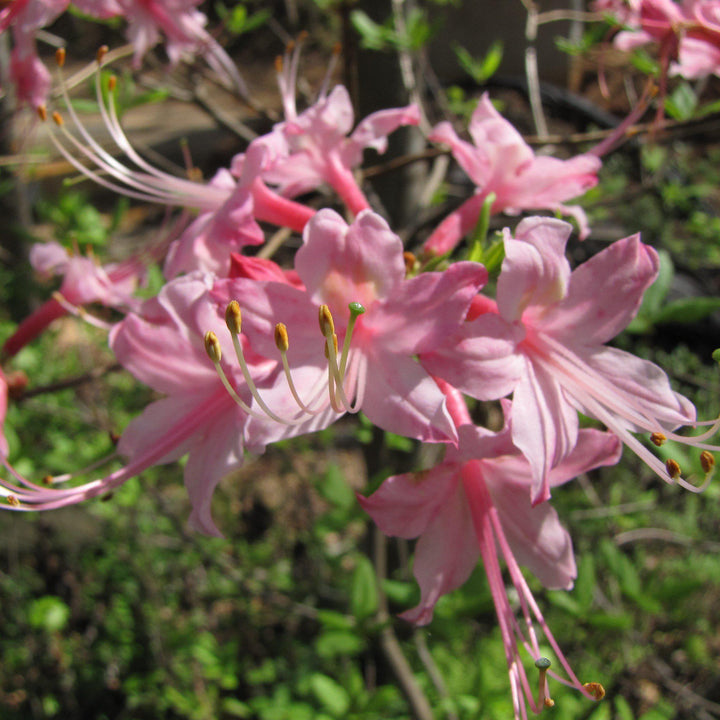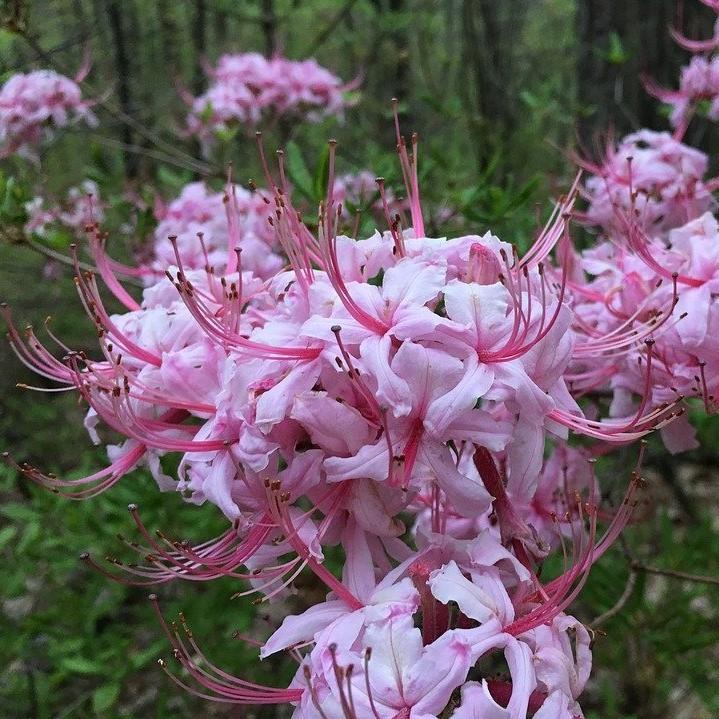Piedmont Azalea is a large native deciduous shrub with finely toothed dull green foliage with grey undersides that turns rusty red in fall. Sweetly fragrant clusters of pink honeysuckle-like flowers with darker pink bodies and elongated pink stamen bloom in early spring. Grows best in dappled sun and rich, consistently moist, well-drained acidic soils. If allowed to naturalize, can reach a size of 6-15'.