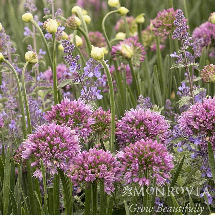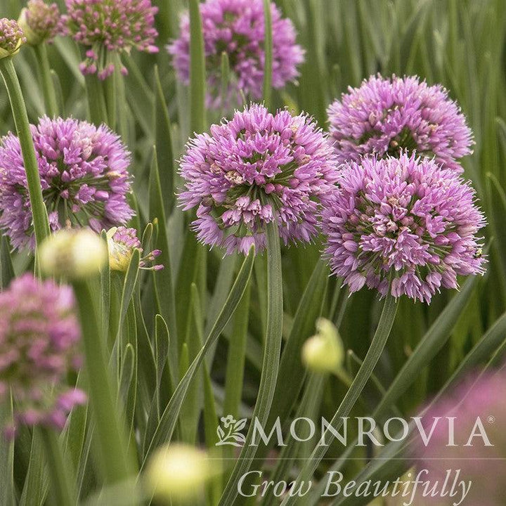 Allium 'Millenium' is a perennial plant known for its round, rosy-purple blooms that appear in mid to late summer. These blooms are made up of many tiny flowers and can create a striking display in your garden. The plant's leaves are also quite attractive, being a glossy deep green color.