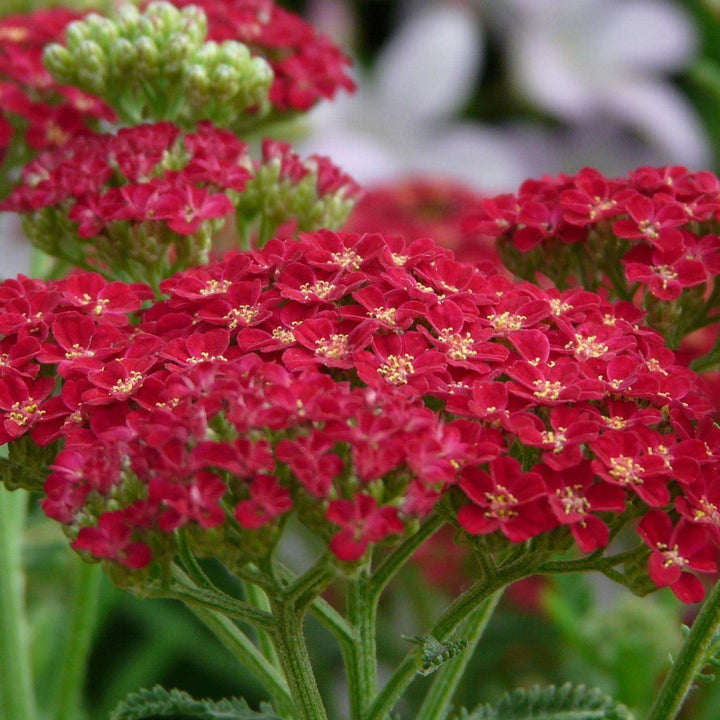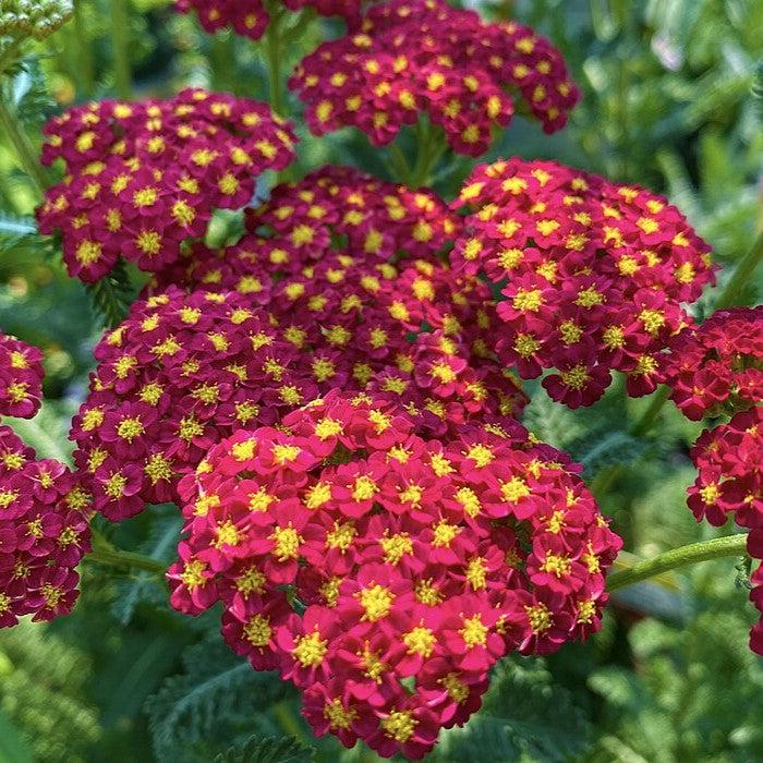 Desert Eve Deep Red Yarrow is a compact upright, clump-forming herbaceous perennial with aromatic medium green foliage. Small, scarlet flowers that deepen with age and dark yellow centers bloom in huge clusters on sturdy stems above the foliage throughout summer into fall if deadheaded. An excellent cut flower that retains color when dried. Heat and drought tolerant. Prefers full sun and well-drained soils.