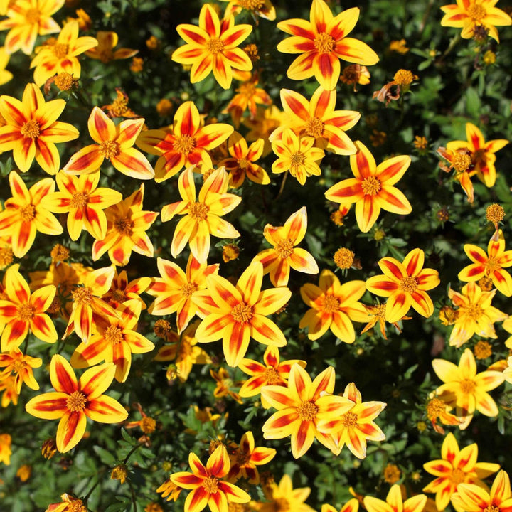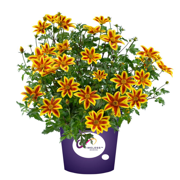 Monrovia® Blazing Star Bidens is a compact, upright herbaceous annual with fine rich green foliage and wiry stems.  Abundant blooms of rich yellow flowers with bold red centers bloom throughout spring and into summer attracting bees and butterflies.  Best performance in sunny well-drained areas.  Drought tolerant.