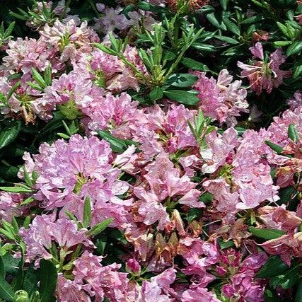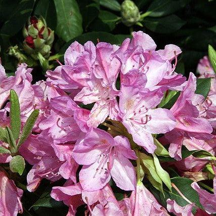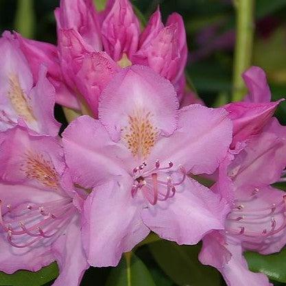 Roseum Pink Rhododendron is a dense, fast-growing mounding evergreen shrub with a central trunk and leathery dark green foliage. Large clusters of clear pink flowers with a hint of lavender bloom in late spring. A very versatile plant that prefers morning or partial sun with acidic rich, well-drained soils. Azaleas are excellent pollination and butterfly attractors.
