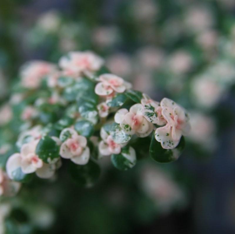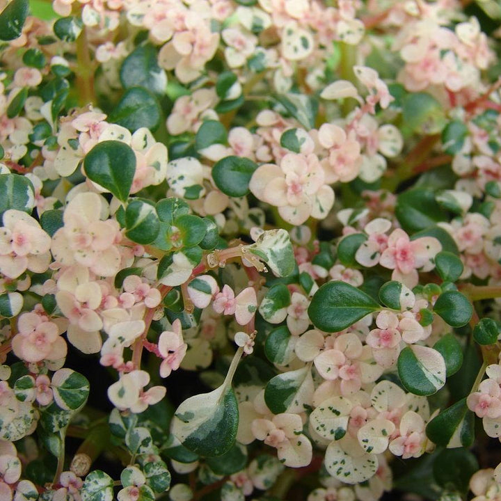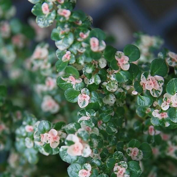 Variegated Pilea is a small trailing tropical plant often used for terrariums with tiny, delicate looking green foliage with white and pink variegation on pinkish stems. Grows best in indirect sun and rich, consistently moist well-drained soils. Rarely flowers when grown indoors.
