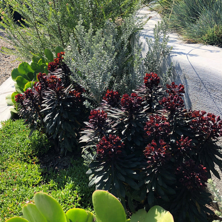 Blackbird Euphorbia is a compact evergreen perennial that grows in a mound.  Its upright whorls emerge dark red and mature to deep green, or near black purple in full sun.  Inflorescences of tiny yellow-green flowers bloom on burgundy stems from late spring into summer, attracting bees and butterflies, and the brackets can darken to burgundy if left on the plant.  Best shape in full sun and dry, well-drained soils.  Broken stems have a milky white sap that can cause significant skin irritation and is poisonous if ingested.