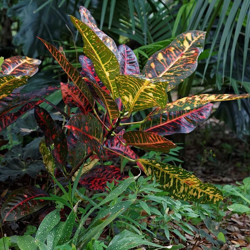 Croton is a woody tropical evergreen perennial with large, extremely colorful foliage that is commonly used as a houseplant. The glossy oblong to sword-shaped foliage comes in a range of bold splotching or striped variegation and intense colors ranging from yellow, pink, orange, red, bronze, purple and green. It rarely flowers as a houseplant, but if it does the creamy white spadix is enclosed by a pale green spathe in late summer or early fall. Insignificant raceme of small white flowers bloom seasonally. Has the best color with good indirect sun, good humidity, and consistently moist well-drained soils.
