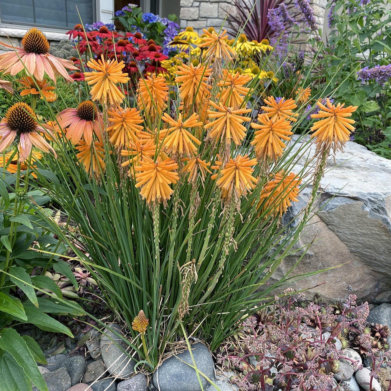 Sunset Dwarf Red Hot Poker is a compact semi-evergreen perennial with upright grass like dark green leaves. A succession of thick showy spikes sporting a bottle -brush like cluster of flowers that transition from bright yellow at the bottom of the spike to rich orange at the tips bloom on naked stems throughout summer into fall. Best color in full sun and rich well-drained soil. The flowers attract bees, butterflies, and hummingbirds.