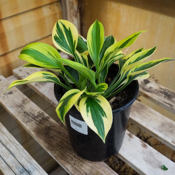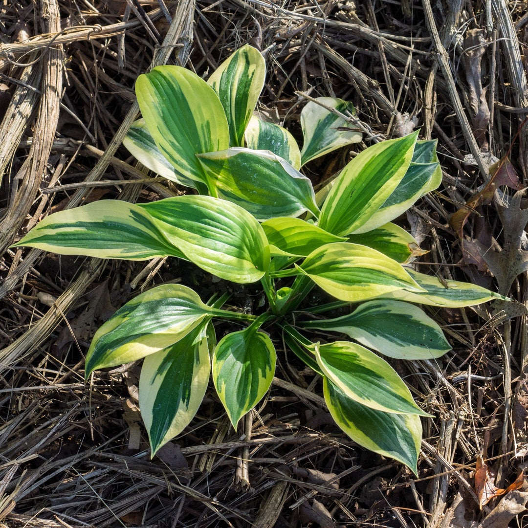 Twilight Hosta is a compact shade-loving herbaceous perennial primarily grown for its foliage. The large heart-shaped basal leaves are vibrant dark green with bold irregular golden margins. Small bell-like lavender flowers raise up in terminals from the rootstalk above the mound in mid summer attracting butterflies and pollinators. Best color in partial sun and moist well-drained soils. Twilight is slug resistant.
