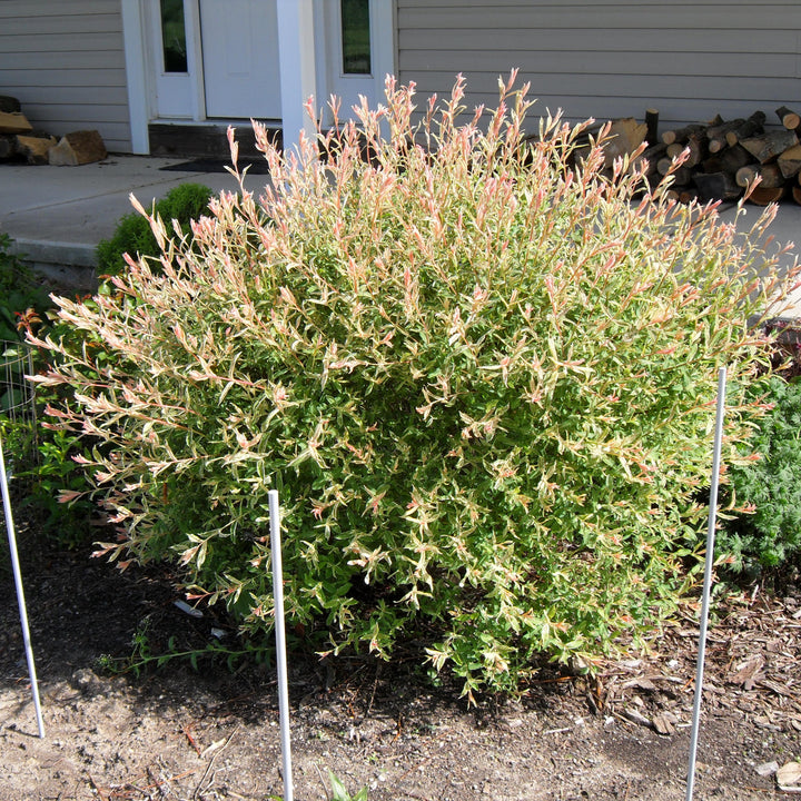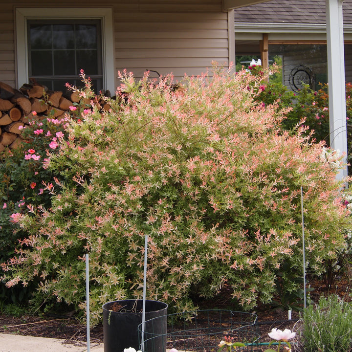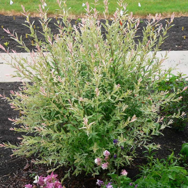 Flamingo Dappled Willow is a compact multi-stemmed deciduous shrub that grows as an upright mound with variegated foliage on red stems. The foliage emerges pink, matures to green with white speckles, and gradually shifts to mostly green as summer progresses. The flowers are insignificant. Thrives in full sun, or afternoon shade in southern climates, and consistently well-drained soils. More sunburn resistant than other variegated varieties.