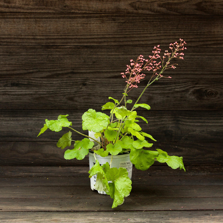 Pistachio Ambrosia Heuchera is an evergreen herbaceous perennial with a robust low mounding habit grown for its dramatic basal foliage. The large round-lobed lime chartreuse foliage that turns golden chartreuse with more sun. Flowering stems sporting airy clusters of pink bell-like flowers go up in midsummer attracting butterflies. Best color best in partial sun and moist well-drained soils.