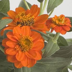 Profusion Double Fire Zinnia is a compact annual with a low mound and showy double fiery orange daisy-like flowers from late spring till frost.  Flowers best in full sun and rich, dry to average well-drained soils.  The Profusion series is heat and drought tolerant and has exceptional resistance to powdery mildew.