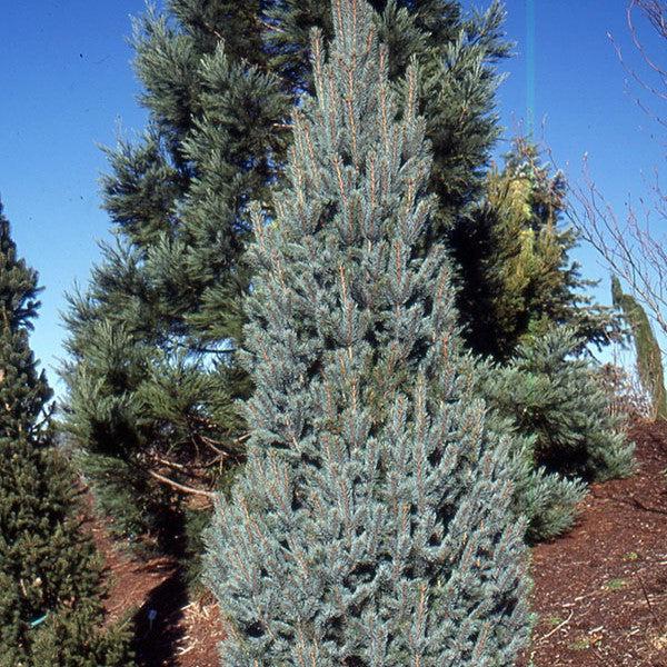 Globe Blue Spruce is a low, slow-growing native conifer shrub with a flat-topped mounded form. Its short blue-green needles emerge with a silvery tint and brighten in summer. Prefers full sun and rich, moist well-drained acidic soils.