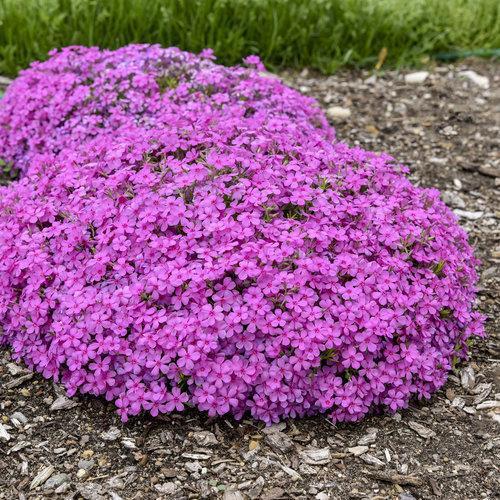Ruby Riot Creeping Phlox is a low-growing native evergreen perennial with dark green awl-shaped foliage. The dense carpet of larger ruby pink flowers with magenta eyes nearly cover the foliage in spring attracting butterflies. Best flowering in full sun and rich, moist, well-drained soils. Powdery mildew resistant and drought tolerant.