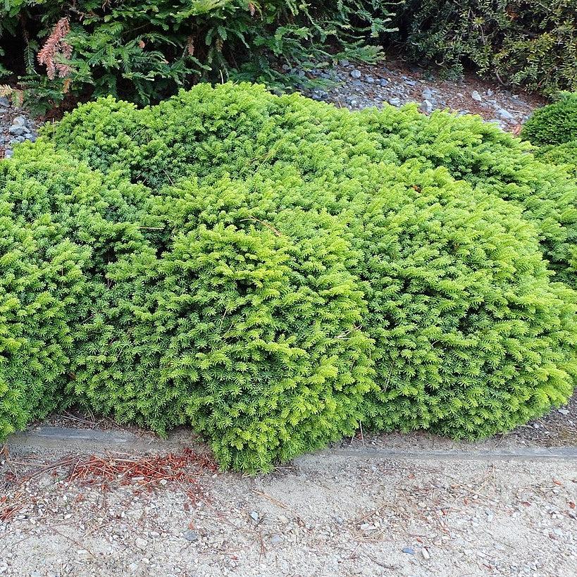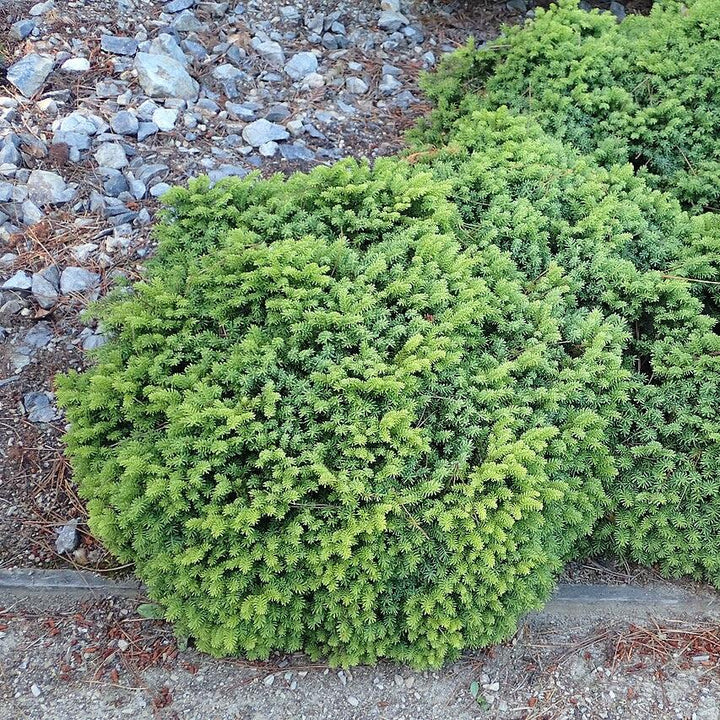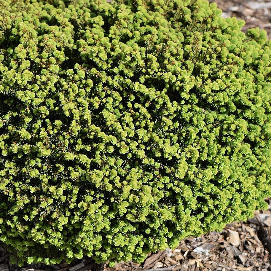 Little Gem Norway Spruce is a very slow-growing dwarf conifer shrub with a dense, naturally flattened global habit and rich green needles that emerge bright green. Prefers full sun and evenly moist, well-drained acidic soils. Tolerates deer and drought.