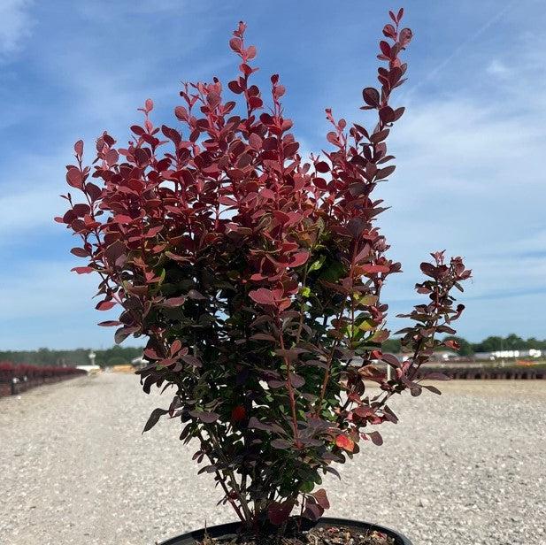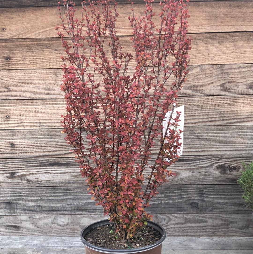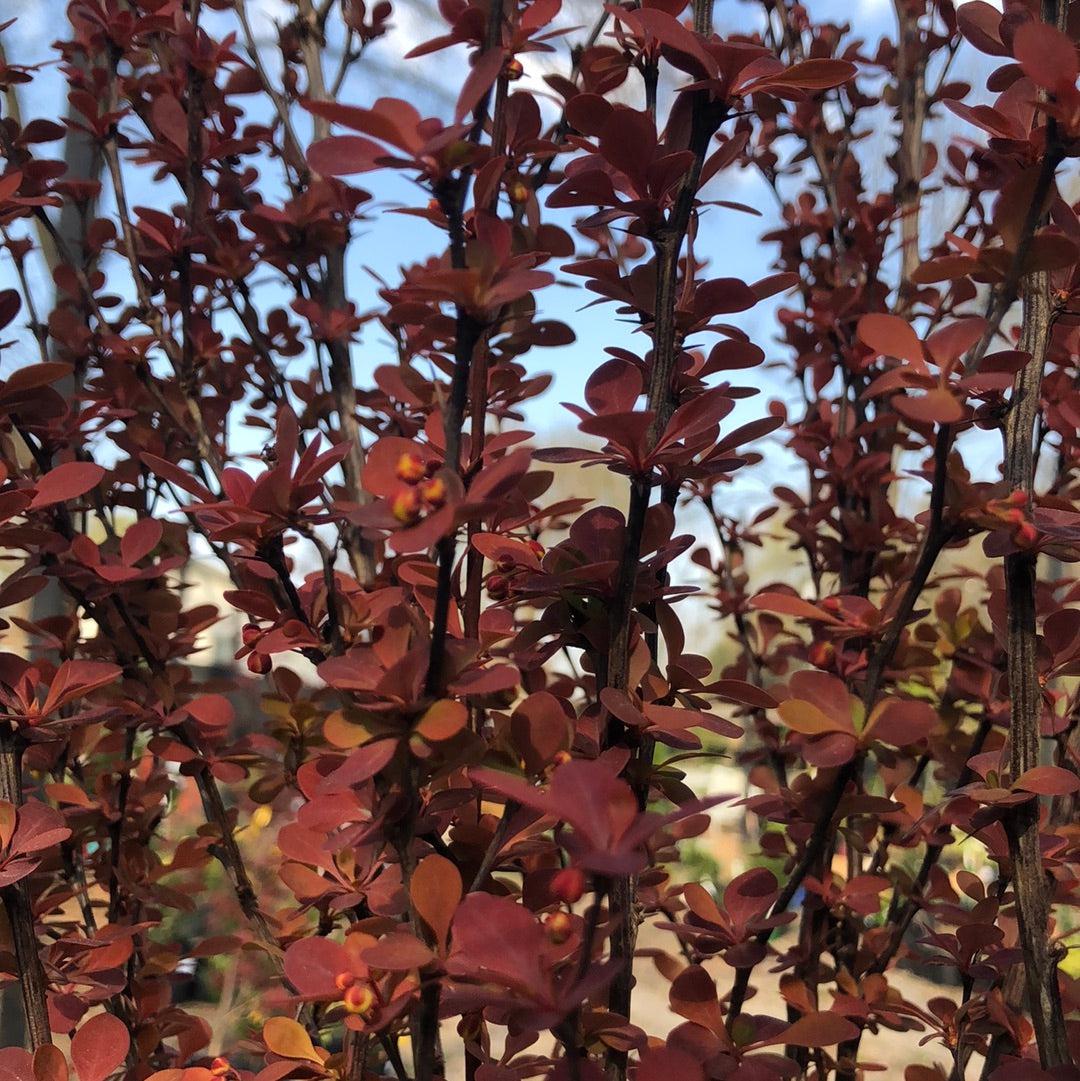 Orange Rocket Barberry is a narrow upright branching deciduous shrub valued for its vibrant foliage that grows full to the ground. The small leaves emerge in spring as a coral orange and matures to medium green before turning shades of purple for fall. Unnoticeable tiny yellow flowers bloom in spring that gives way to small amounts of fruit. Best color in full sun and well-drained soils. Drought and deer resistant. Asexual propagation is prohibited. Orange Rocket is resistant to rust.