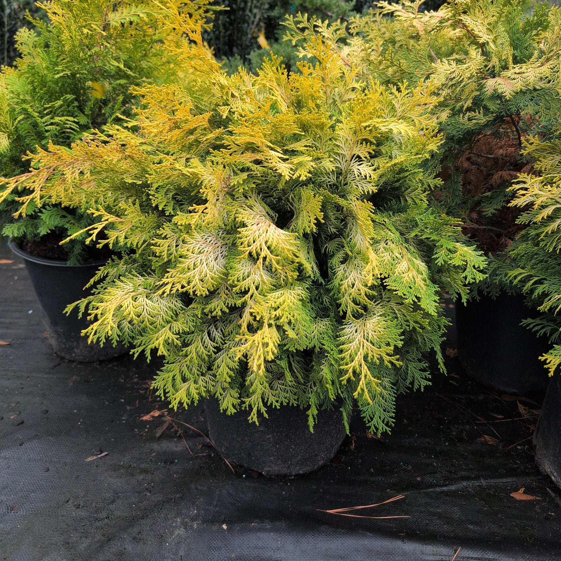 Golden Hinoki False Cypress is an evergreen conifer shrub with a loose upright habit. Its feathery scale-like leaves are a bright gold-yellow that droop slightly at the end and holds its color well in winter. Prefers full sun and moist well-drained soil.