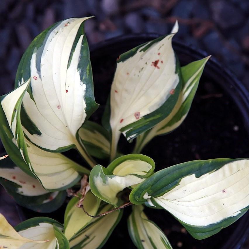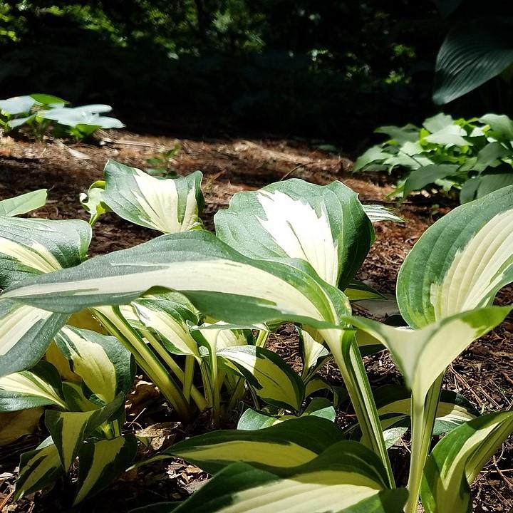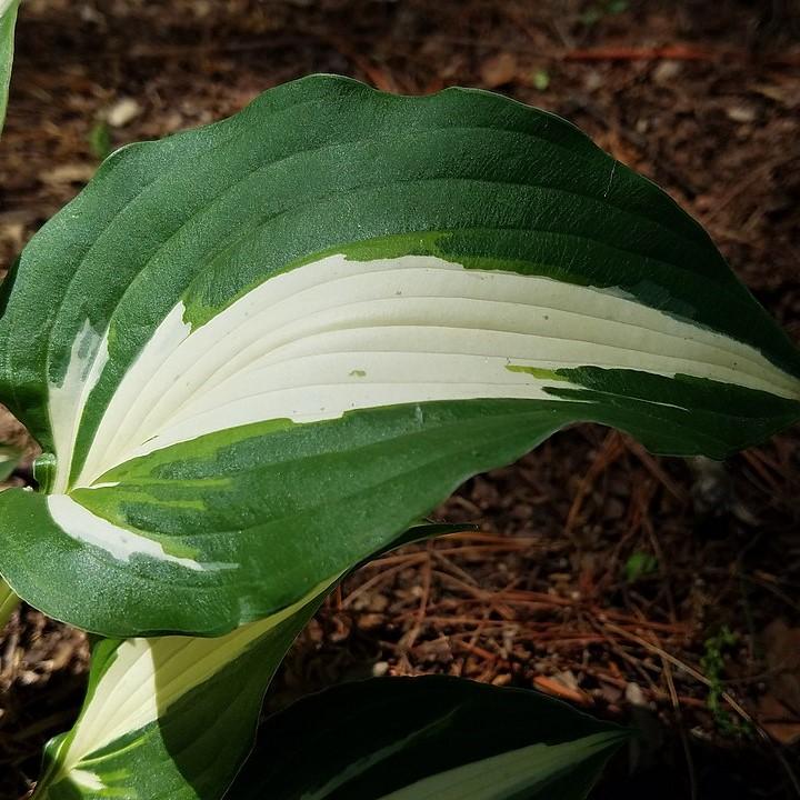 Loyalist Hosta is a shade-loving herbaceous perennial primarily grown for their attractive large foliage. The lightly corrugated basal leaves have a near white center and wide dark green irregular margins. The bell-like white flowers raise up in terminals from the rootstalk above the mound in mid-summer attracting butterflies. Best bloom in partial sun and moist well-drained soils. Minuet Man is resistant to slug damage.