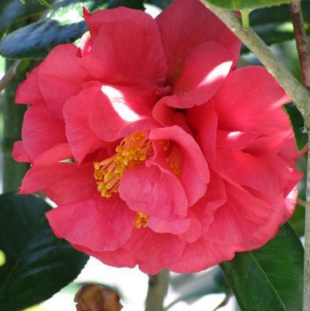 Kramer’s Supreme Camellia is a large slow-growing evergreen shrub with a rounded habit.  Its glossy evergreen leaves stay deep green year-round.  Kramer’s Supreme Camellia has large, fragrant, full peony form red flowers with contrasting yellow stamen that bloom from winter into spring attracting butterflies.  Best blooms occur in partial sun and acidic, well-drained soil.