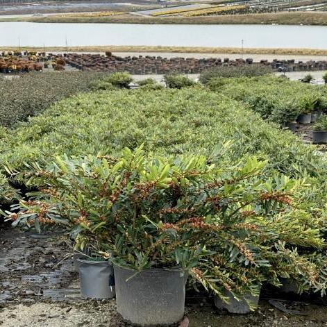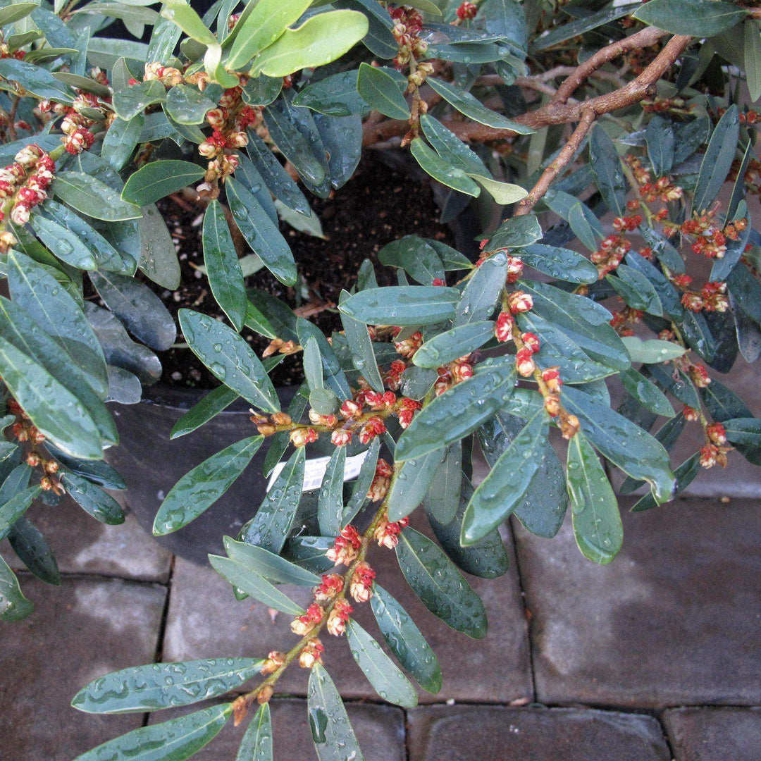 Distylium is a flat-topped evergreen shrub with gracefully arching branches. Its willow-like leaves have a bluish hue and small fringed red flowers bloom in thick clusters in early spring attracting butterflies and pollinators. Grows best in full sun and slightly acidic, moist well-drained soil. Tolerates drought and wet soils.