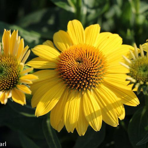 Lemon Yellow Improved Echinacea is a compact freely branching native perennial with strong upright stems that do not need staking and aromatic dark green foliage. Heavy blooms of fragrant bright yellow flowers with overlapping petals and large raised cones begin in late spring and all through summer. Thrives in full sun and well-drained soils. The flowers attract butterflies and bees, and spent stems will stay erect and attract birds if not removed. Drought tolerant.