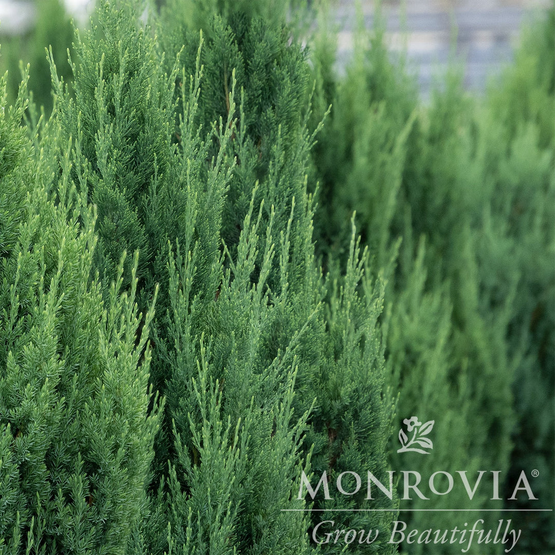 Monrovia® The Blue Point Juniper is known for its dense, pyramidal growth habit and its striking blue-green foliage. It typically reaches a height of 10 to 15 feet (3 to 4.5 meters) with a spread of 6 to 8 feet (1.8 to 2.4 meters), making it suitable for hedges, screens, or as a standalone specimen plant.