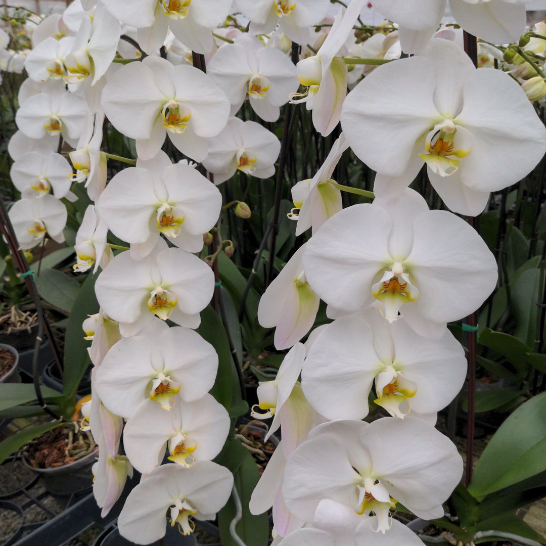 Waterfall Orchid is a popular tropical epiphytic perennial common as a houseplant with thick dark green leathery leaves and dramatic flowers on long cascading bare stems. The large and showy flattened seasonal flowers are exceptionally long lasting in optimal conditions. Grows best with bright indirect sun and well-drained soils.