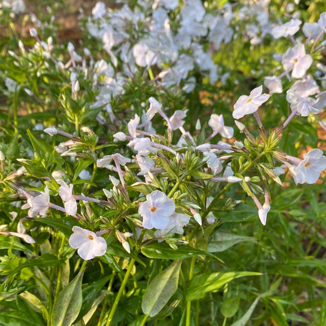 Crystal Phlox is compact perennial with an upright habit and stiff stems covered with leathery dark green foliage.  Large clusters of fragrant white flowers with subtle lilac eyes bloom from late spring into mid summer and may rebloom in fall.  Best flowering in full sun and rich, moist, well-drained soils.  Crystal is powdery mildew resistant.